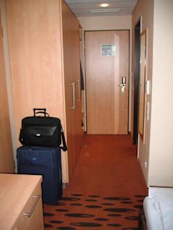 Eingangsbereich des ZimmersWenn man zur Tür herein kam war links das Bad, rechts die Garderobe und ein sehr geräumiger Kleiderschrank. Beim Eintreten sieht man sofort auf die nette Sitzecke. Die Farben der Einrichtung harmonisieren und lassen einen gleich wohlfühlen.