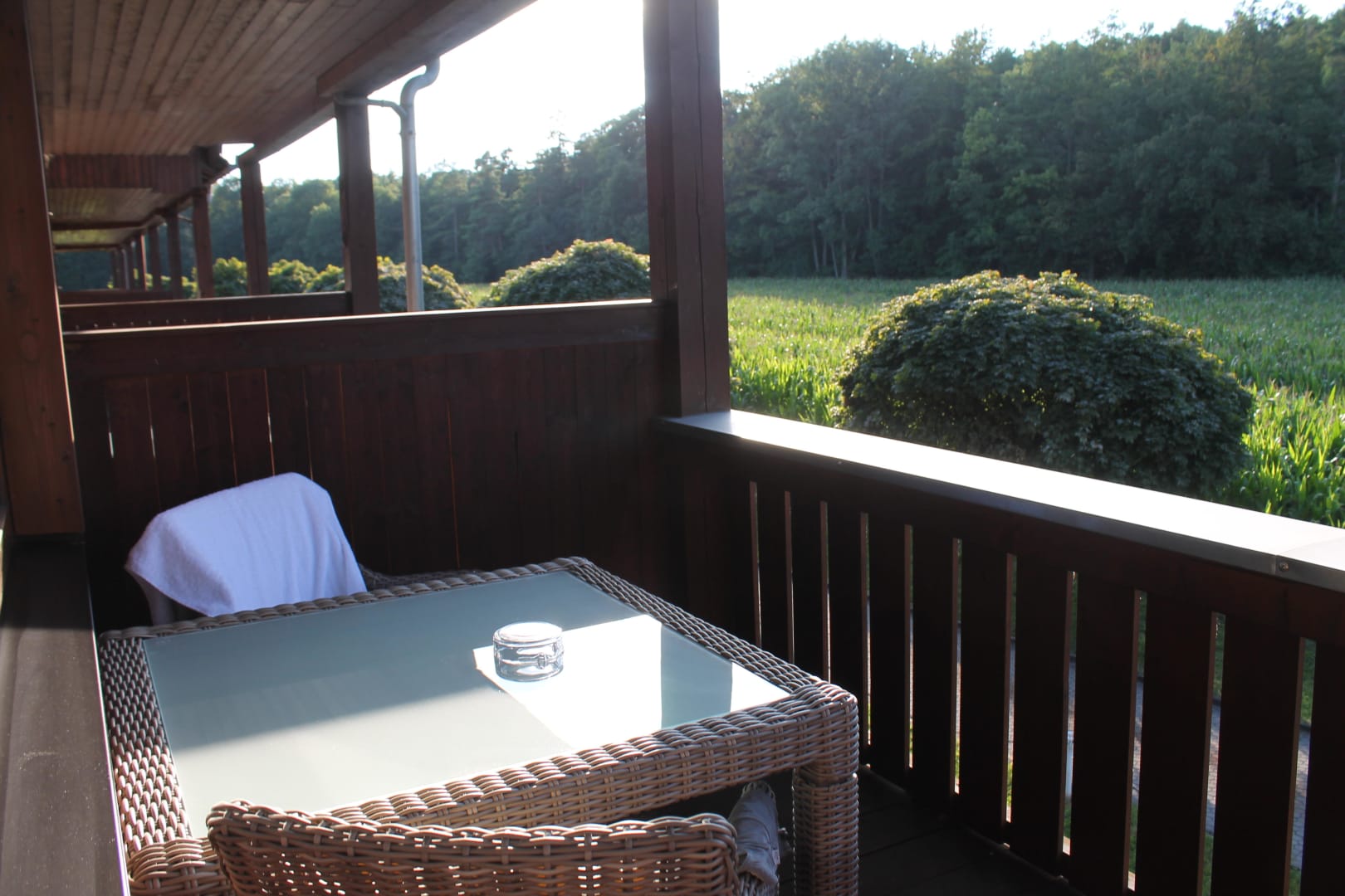 Diese Aufnahme mit einem Blick auf das Maisfeld und den Wald entlang des Hinterhauses vom Hotel Rhön Residence habe ich am 10. August 2012 am frühen Abend vom Balkon des Zimmers 809 aus gemacht.