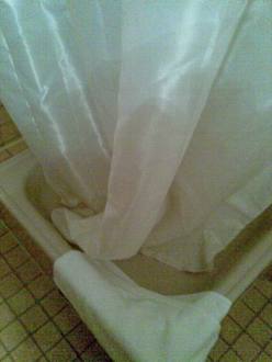 Ein viel zu langer Vorhang verstopft den Abfluss beim Duschen.