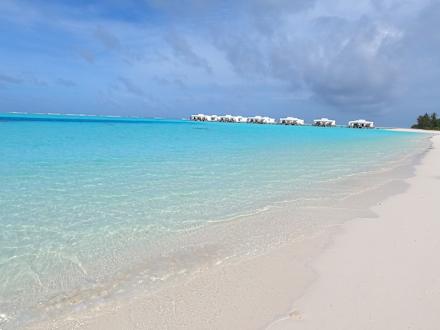 Ausblick vom Strand auf Wasserbungalows