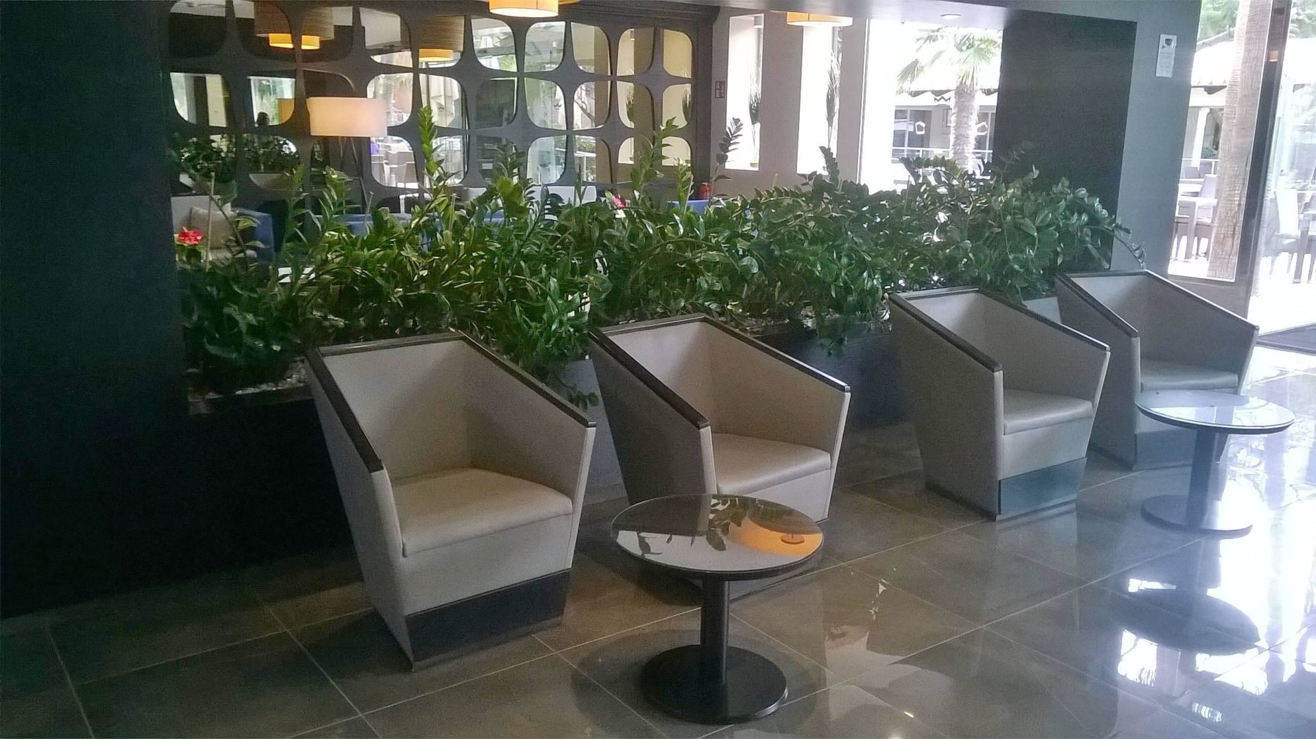 Moderne Sesselmodern, aber aus Kunststoff. Klebt am Popo und kühlt und schwitzt. Sessel sind auch in der Bar vorhanden