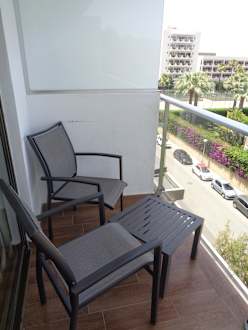 Auf dem Balkon befanden sich zwei Stühle und ein kleiner Tisch.