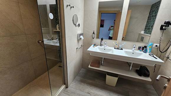 Großes Badezimmer mit Doppelwaschbecken und großer Dusche