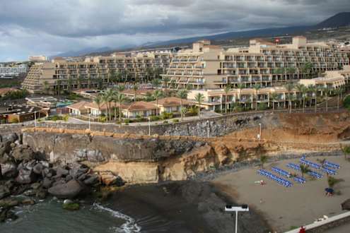 Von der Dachterrasse des Hotels nebenan - Roca Nivaria - hat man einen sehr guten Blick auf das RIU Buena Vista, man kann den dunklen Sandstrand erkennen, der von der Gemeinde angelegt wurde, sowie den Strandweg.