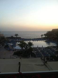 Blick vom Familienzimmer aus auf Poolanlage