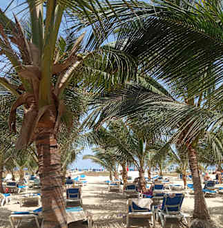 Strand mit Liegen und natürlichem Schatten