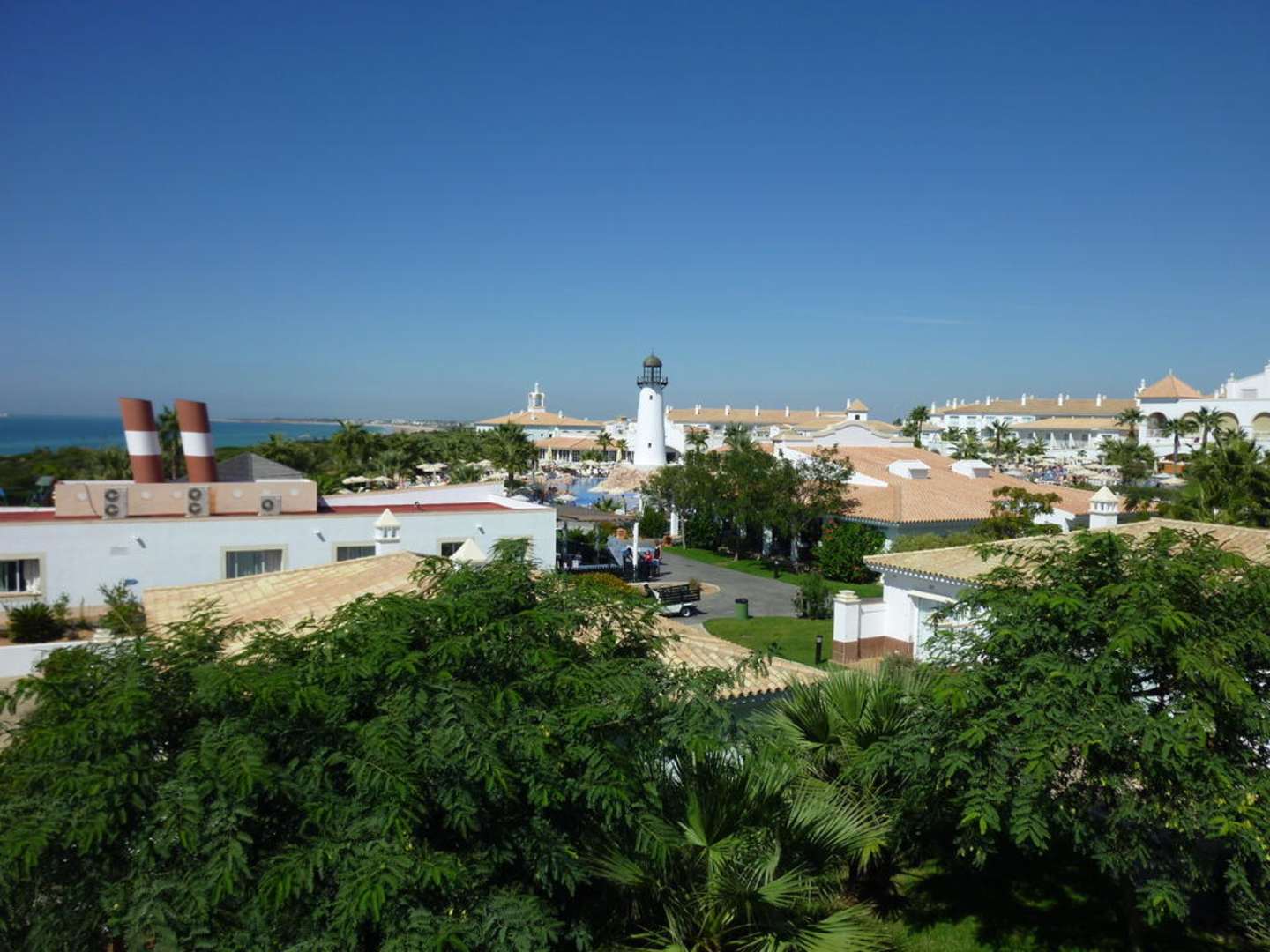 Blick vom BalkonBlick über die Gartenanlage in Richtung Poollandschaft. In der Ferne Strand von Novo Sancti Petri.