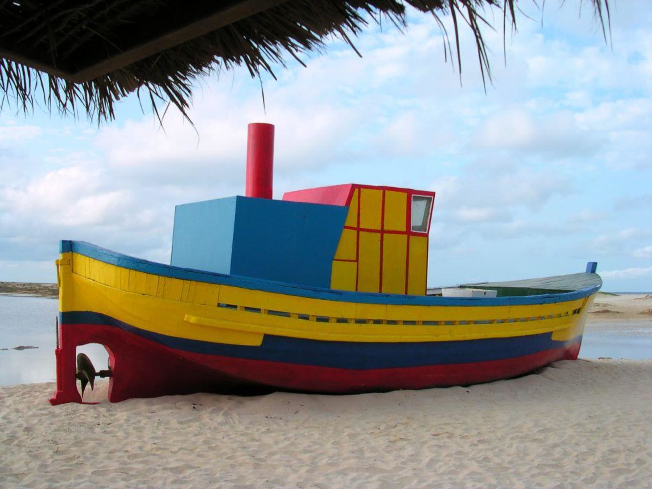 Schiff am Hotelausgang zum StrandIm Hintergrund steht der Fußballplatz unter Wasser.