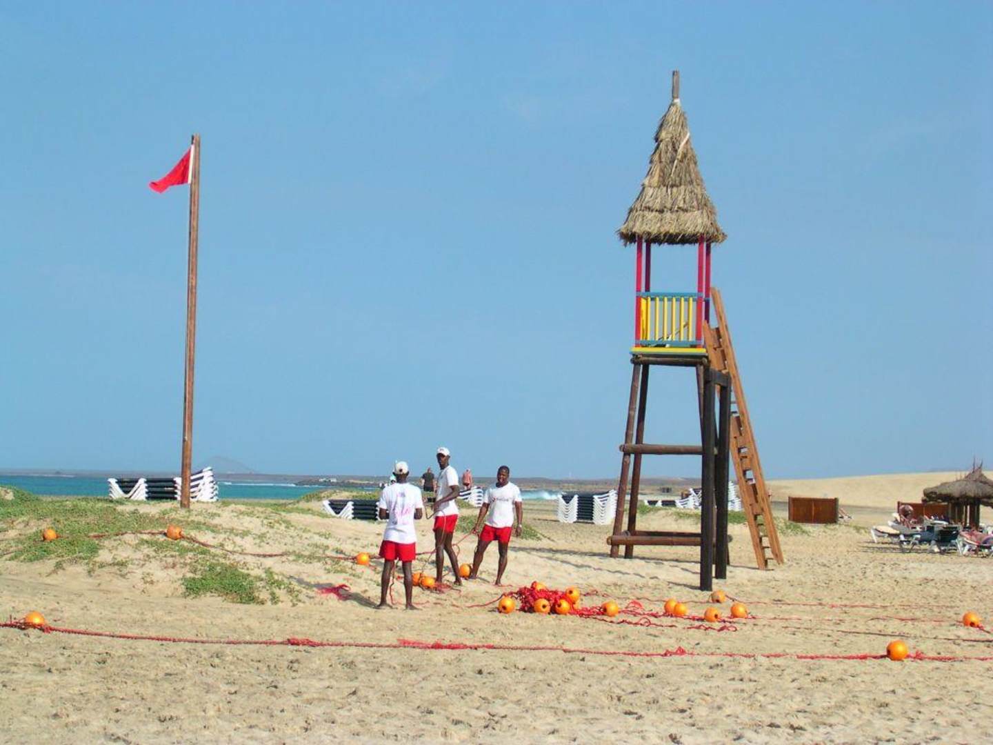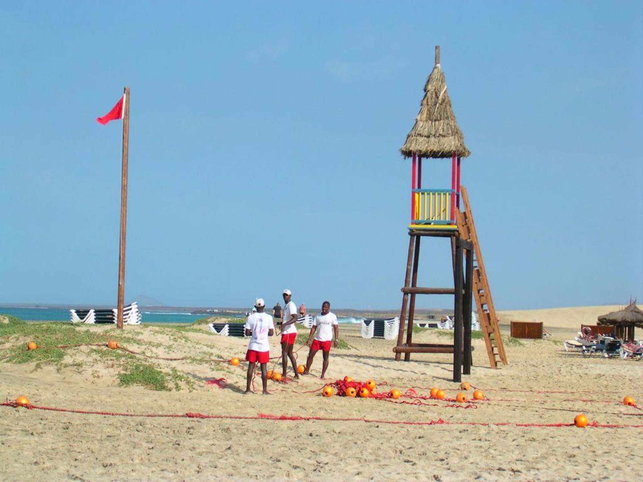 Turm für BaywatchDie Strandaufsicht bringt die weggespülten Bojen an den Strand. Die rote Flagge ist noch gehisst.