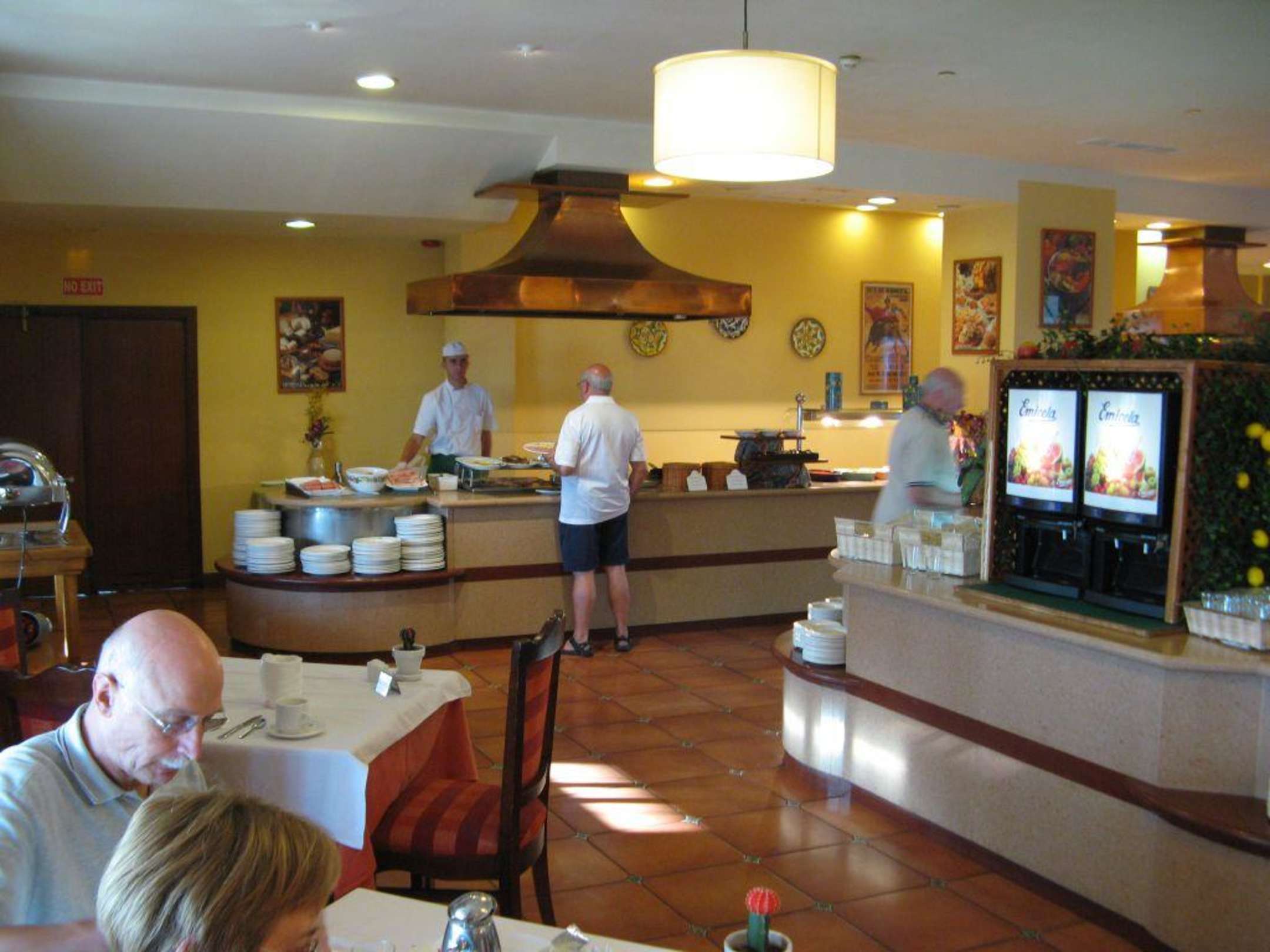 Restaurant FrühstückBlick auf die "Grillstation". Dort werden morgens Eier und Speck gebraten und abends verschiedene Sorten Fleisch.