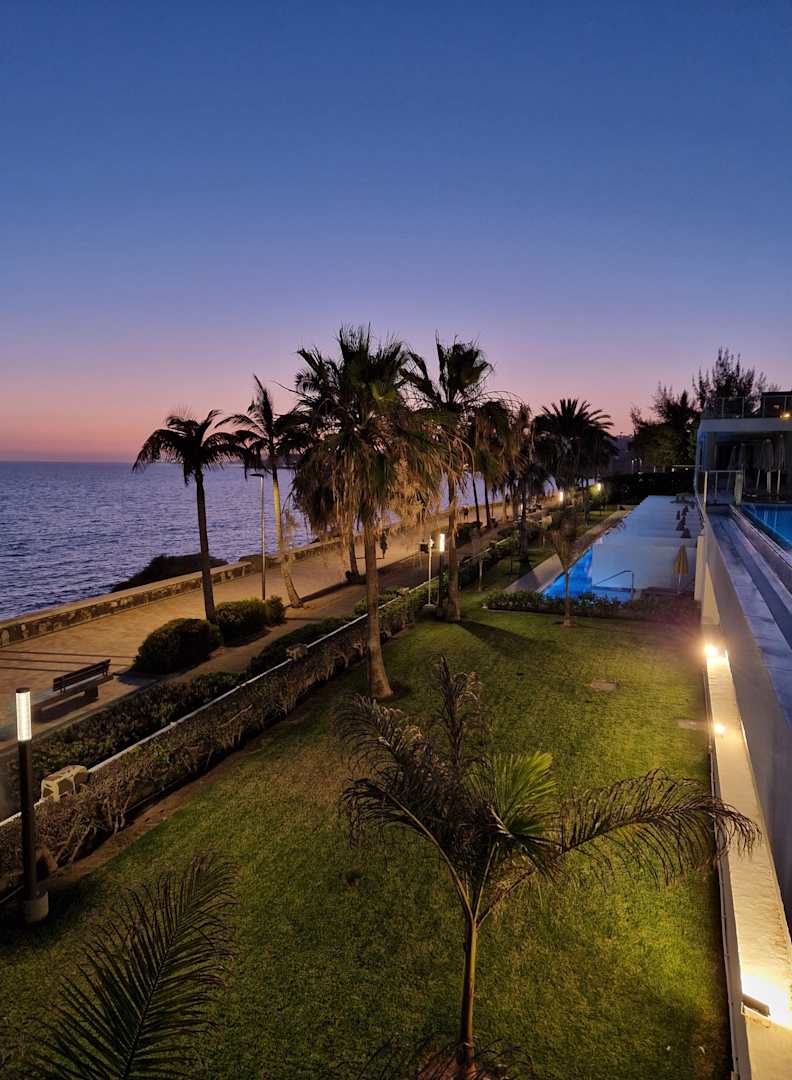 Blick auf die Promenade und die Suiten mit eigenem Pool bei Sonnenuntergang