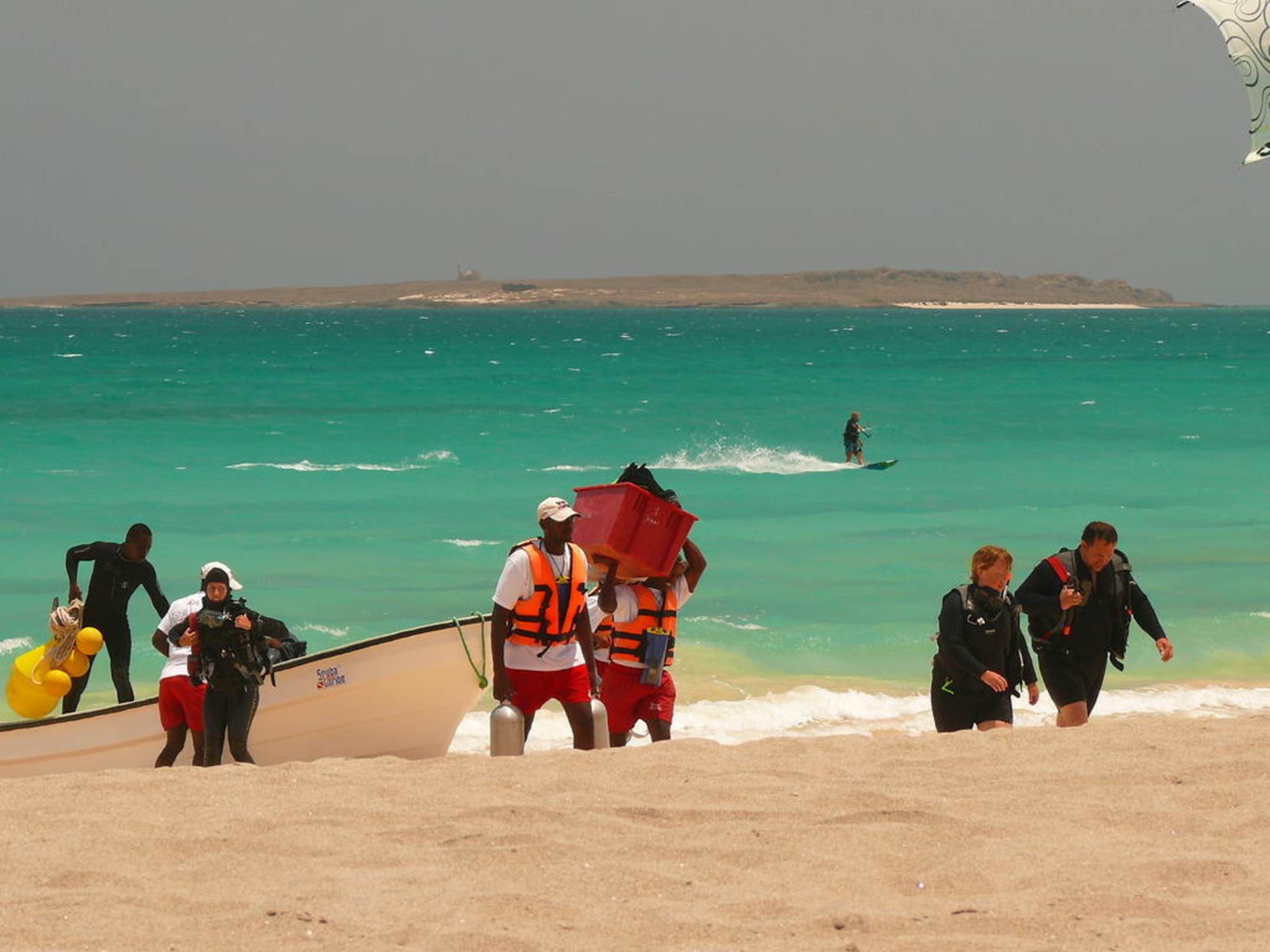Das Wassersport-Angebot ist großIm Vordergrund Rückkehr vom Tauchen, im Hintergrund ein Kitesurfer