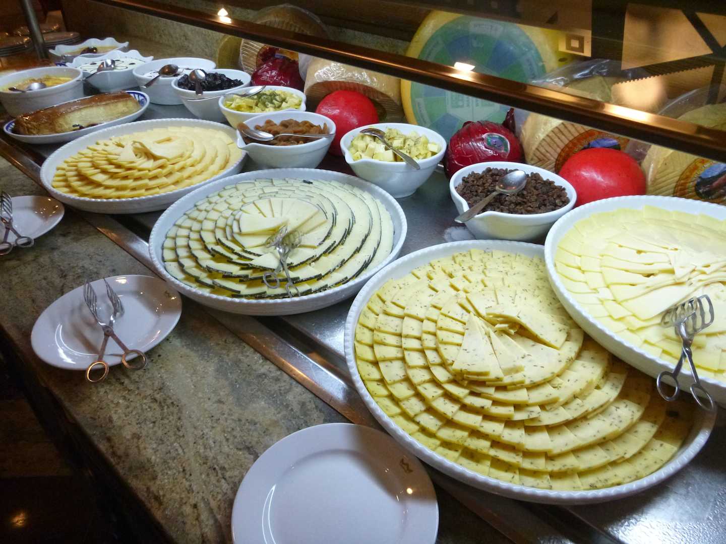 Käseplatten, im Hintergrund süße Versuchungen