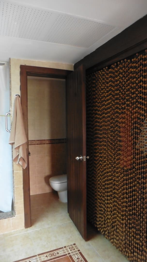 ein Vorhang trennt die Waschseite vom Kleiderschrank, WC hat eine Tür