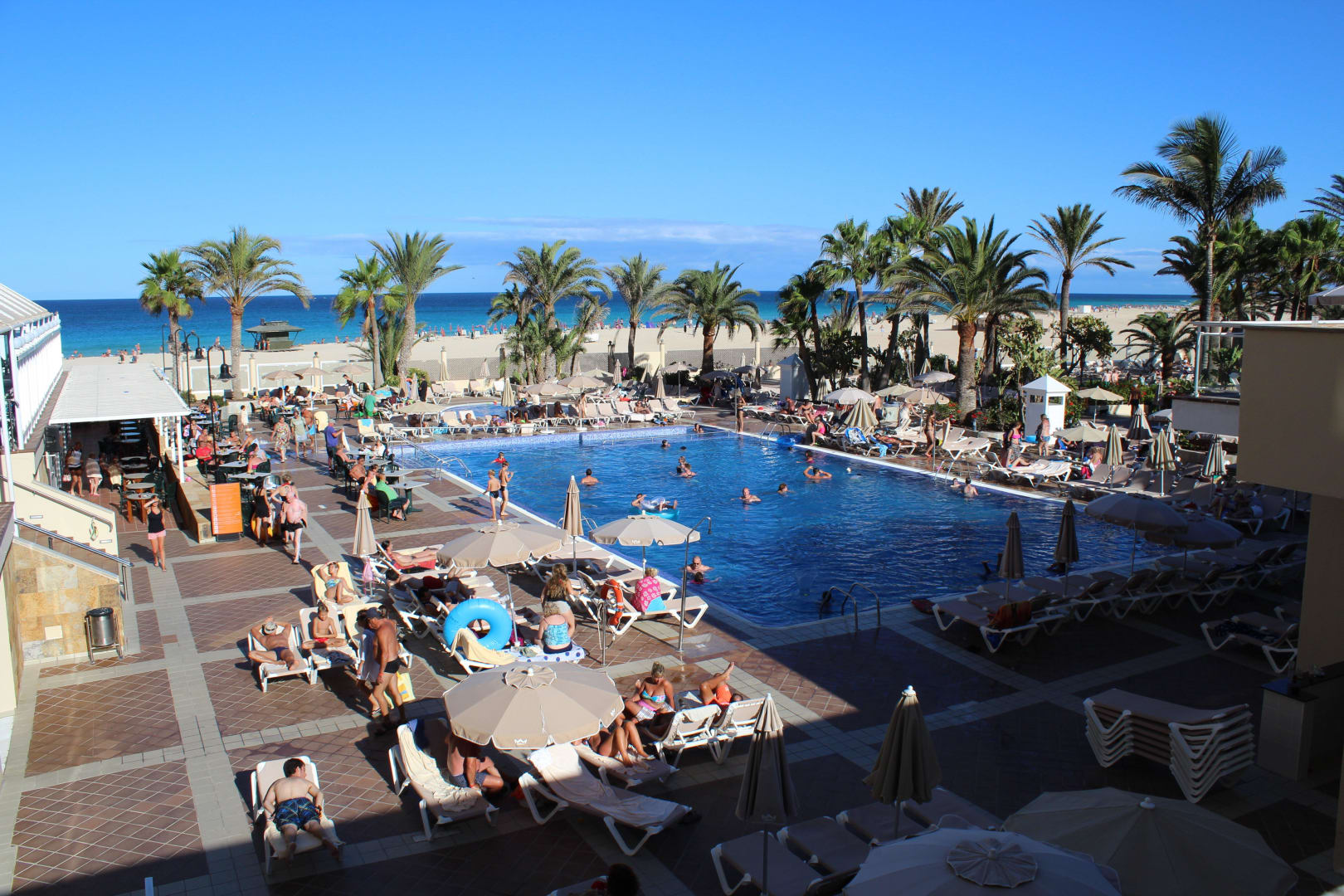 Ansicht von der Dachterrasse auf den Pool Hotel Riu Oliva Beach - Hotel