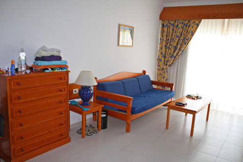 Wonzimmerbereich im FamilienzimmerEine rustikale Couch und Schrank standen im Wohnzimmerbereich. Das Bild zeigt das Zimmer 3228 im Bungalowbereich.
