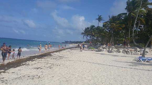 Leider kein Traumstrand mit dem Grass am Strand und im Wasser .