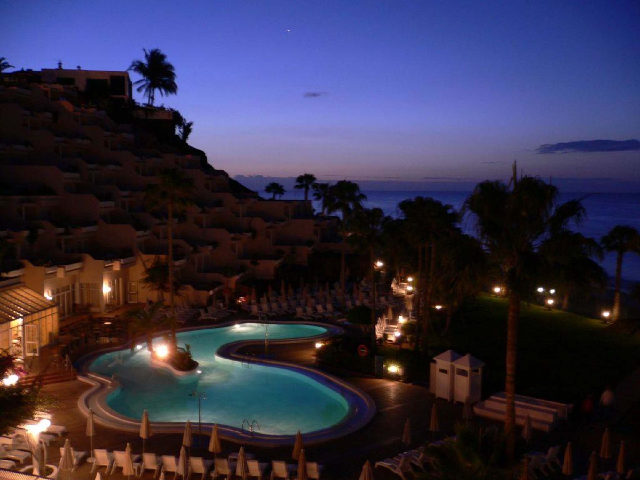 SonnenaufgangSonnenaufgang mit Sicht auf die Poolanlage des Hotels RIU Calypso.