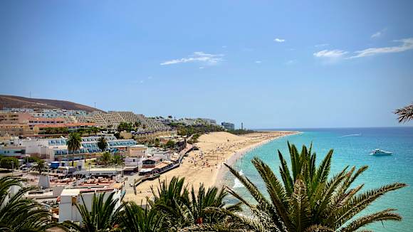 Blick von Morro Jable aus auf den Strand bis zum Leuchtturm El Faro