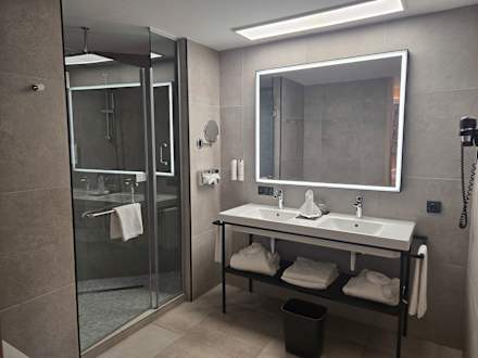 Großes Bad, sehr schön ,in der Dusche eine Sitzfläche,separat Toilette!