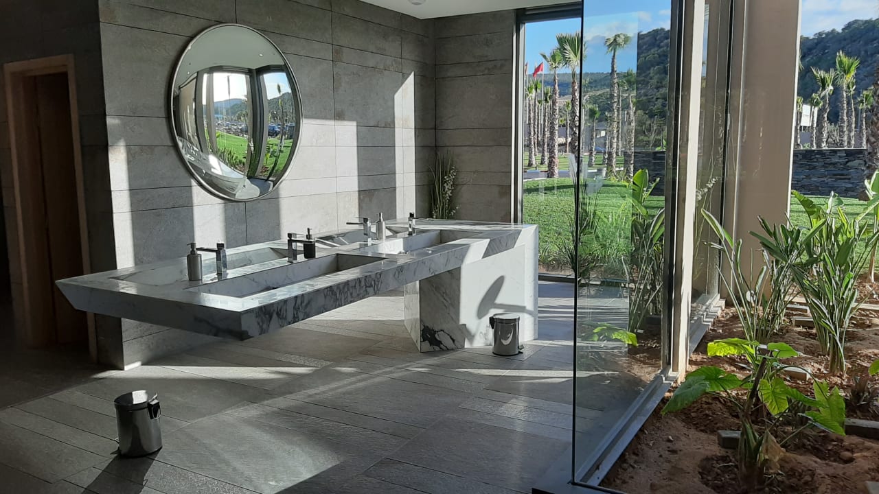 Riesiges Wasserbecken im Eingangsbereich zu den Toiletten