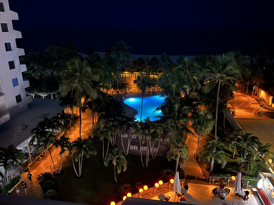 Meerblick über den Pool bis zum Strand vom Balkon am Abend