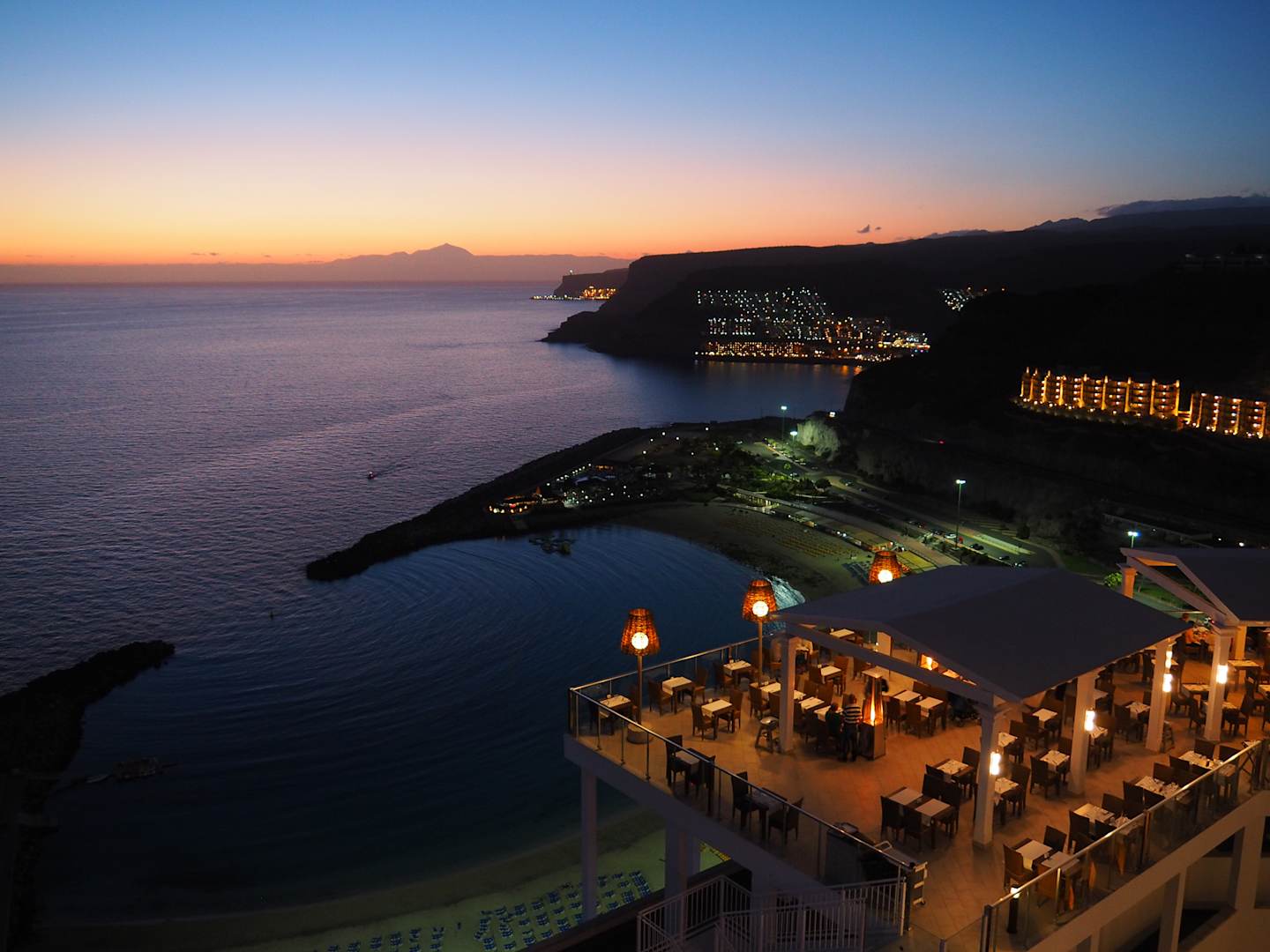 Blick von der Terrasse der Sportsbar auf die Außenterrasse des Hotelrestaurants, den Strand und das Meer bei Sonnenuntergang. Am Horizont ist bei guter Sicht der Berg Teide der benachbarten Insel Teneriffa zu sehen.