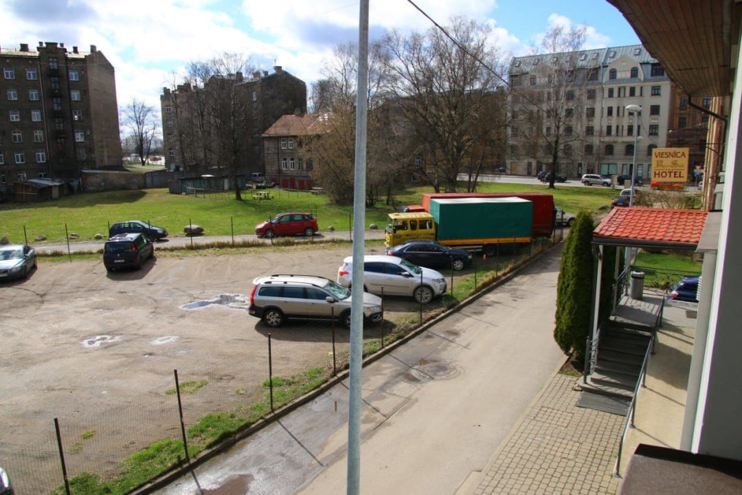 Blick aus dem Zimmerfenster direkt auf den bewachten Parkplatz