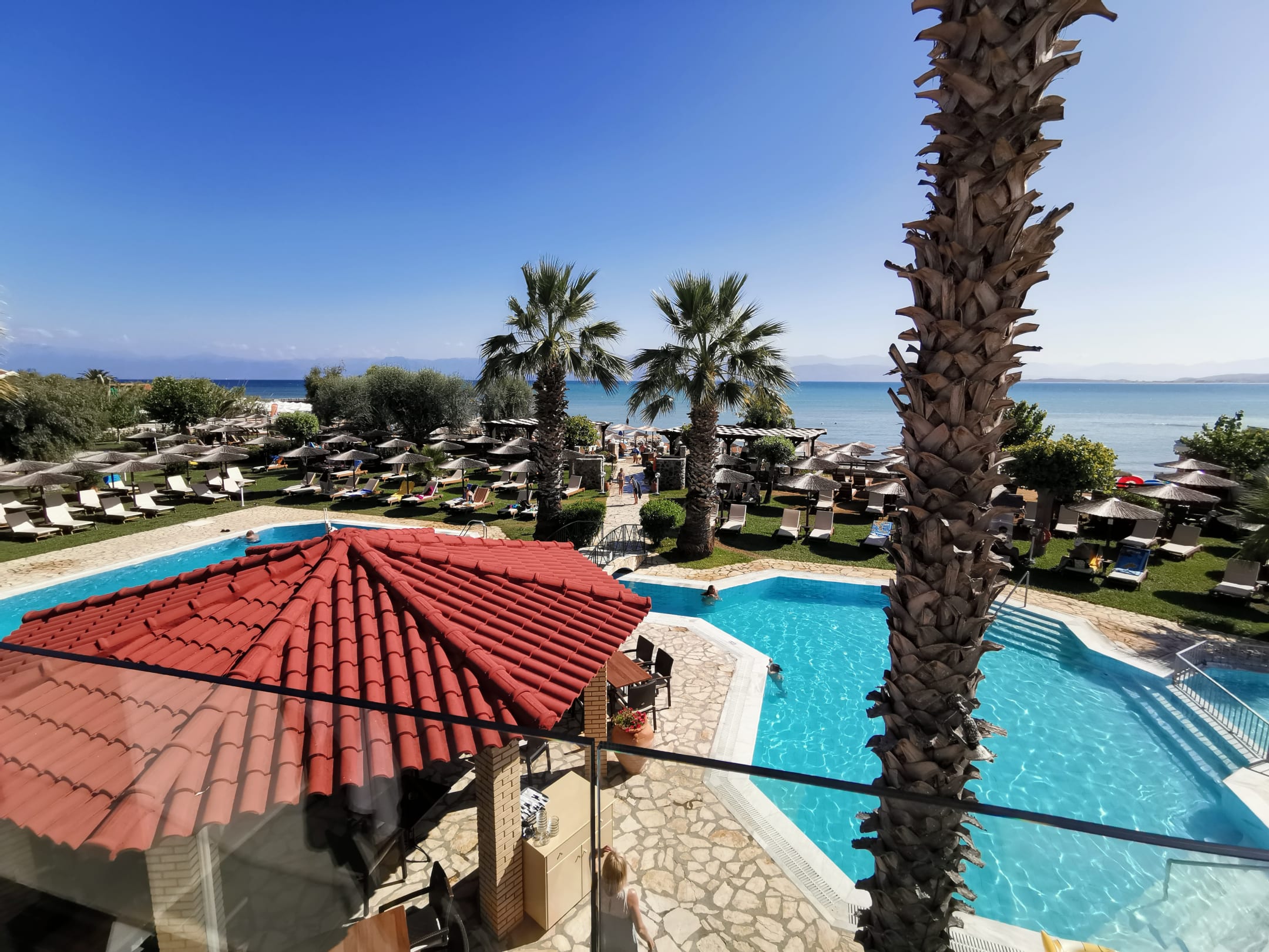 Ausblick vom Essenssaal auf den Pool am Meer und den Strandbereich.