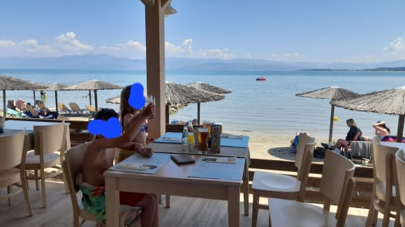 Lecker Essen im Strandrestaurant. Netter Kellner