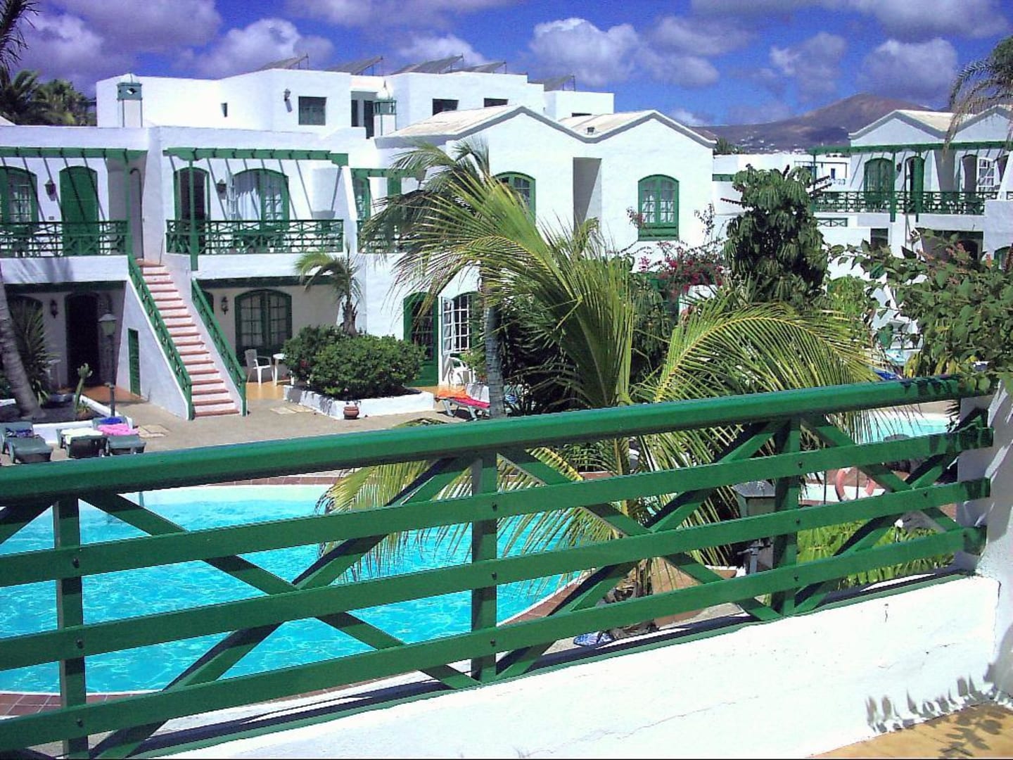 Blick auf Poolanlage vom Balkon