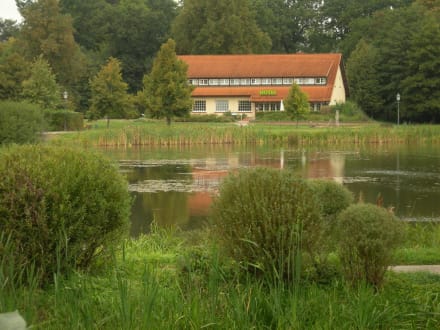 Blick auf das Hotel über den Teich
