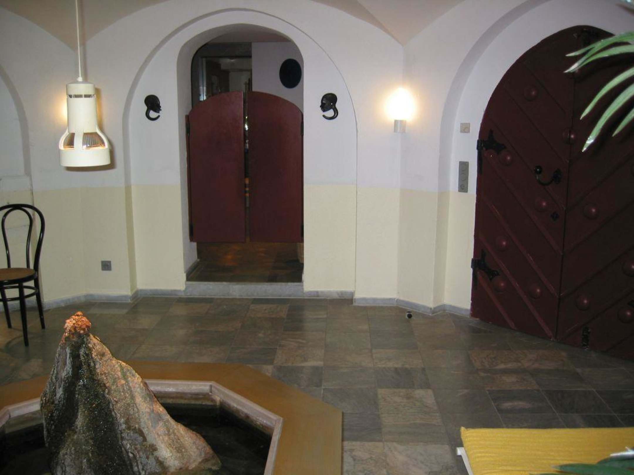 im Ruheraum Sauna Römer Villarechts die Tür zur Kellerbar, links die Pendeltür hinter der sich die Sauna befindet