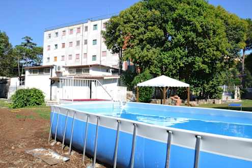 Im Garten des Hotels befindet sich ein (im August gratis benützbarer) Pool. Das Wasser ist zwar nur knapp 1,2 m tief, genügt aber zur Abkühlung an heißen Sommertage vollkommen.