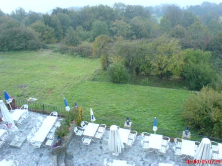 Auf der Terrasse kann man bei schönem Wetter Kaffee trinken und die Aussicht genießen.