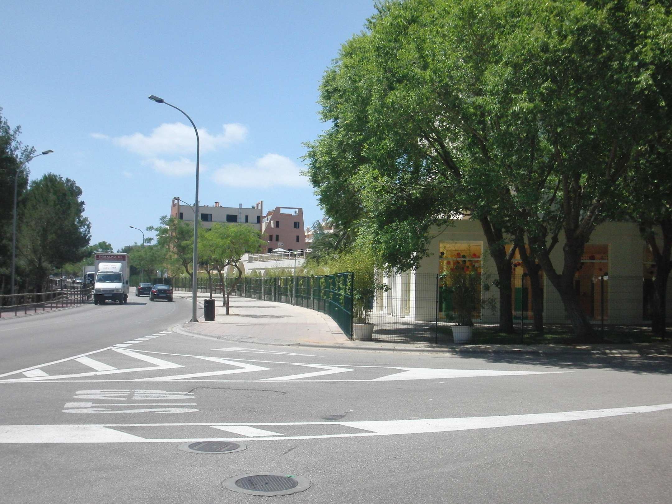 Linksseitig die Strasse CARRER DELS BALADRES, die von Sa Coma nach Cala Millor führt. Die Hotelanlage rechtseitig, im Vorder- grund der Miniclub.