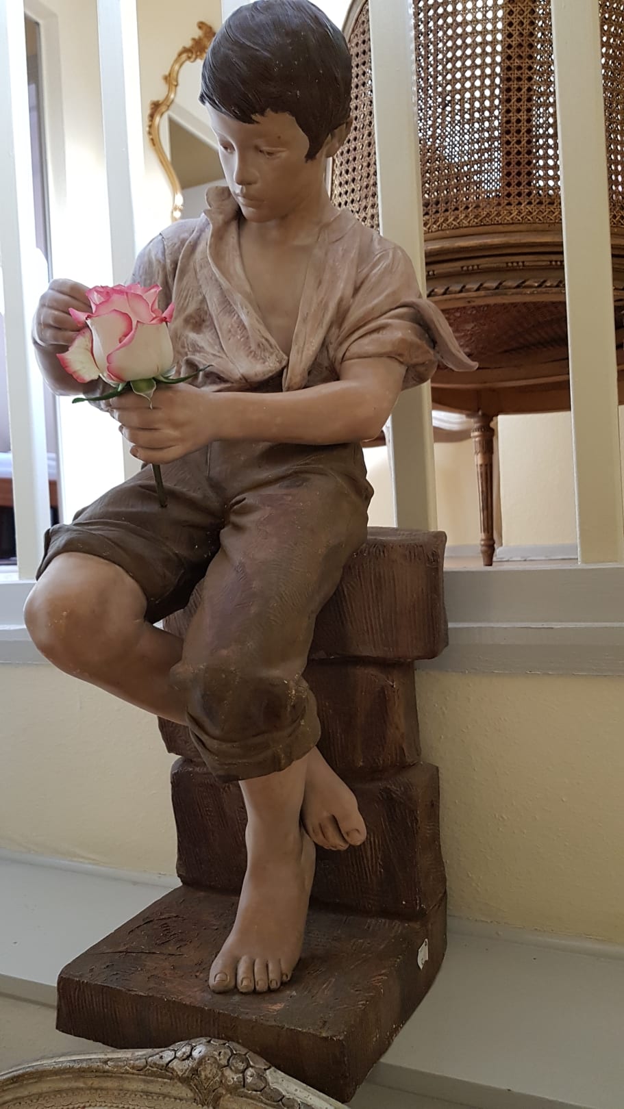 Sorry, habe mir erlaubt dem Jungen eine Rose zu leihen, um ein Foto von ihm zu bekommen. Diese schöne Figur saß im Treppenhaus. Ich habe ihn gleich in mein Herz geschlossen 😉.