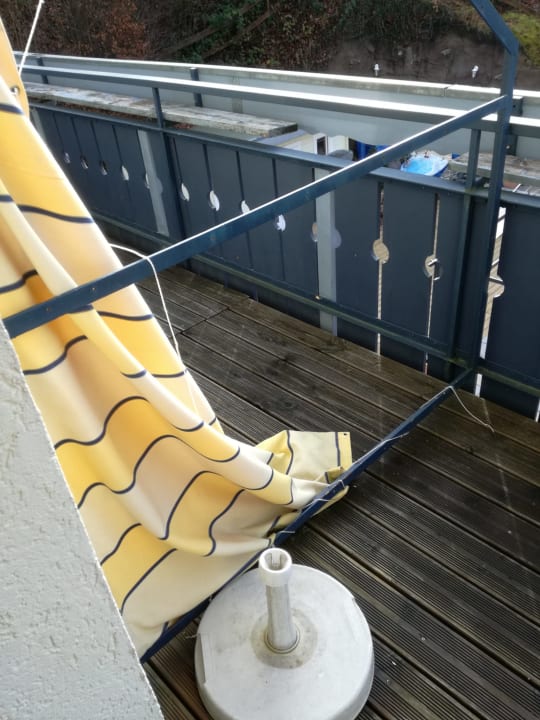 Unser Balkon mit defektem Duschvorhang als Abtrennung zum Nachbar.