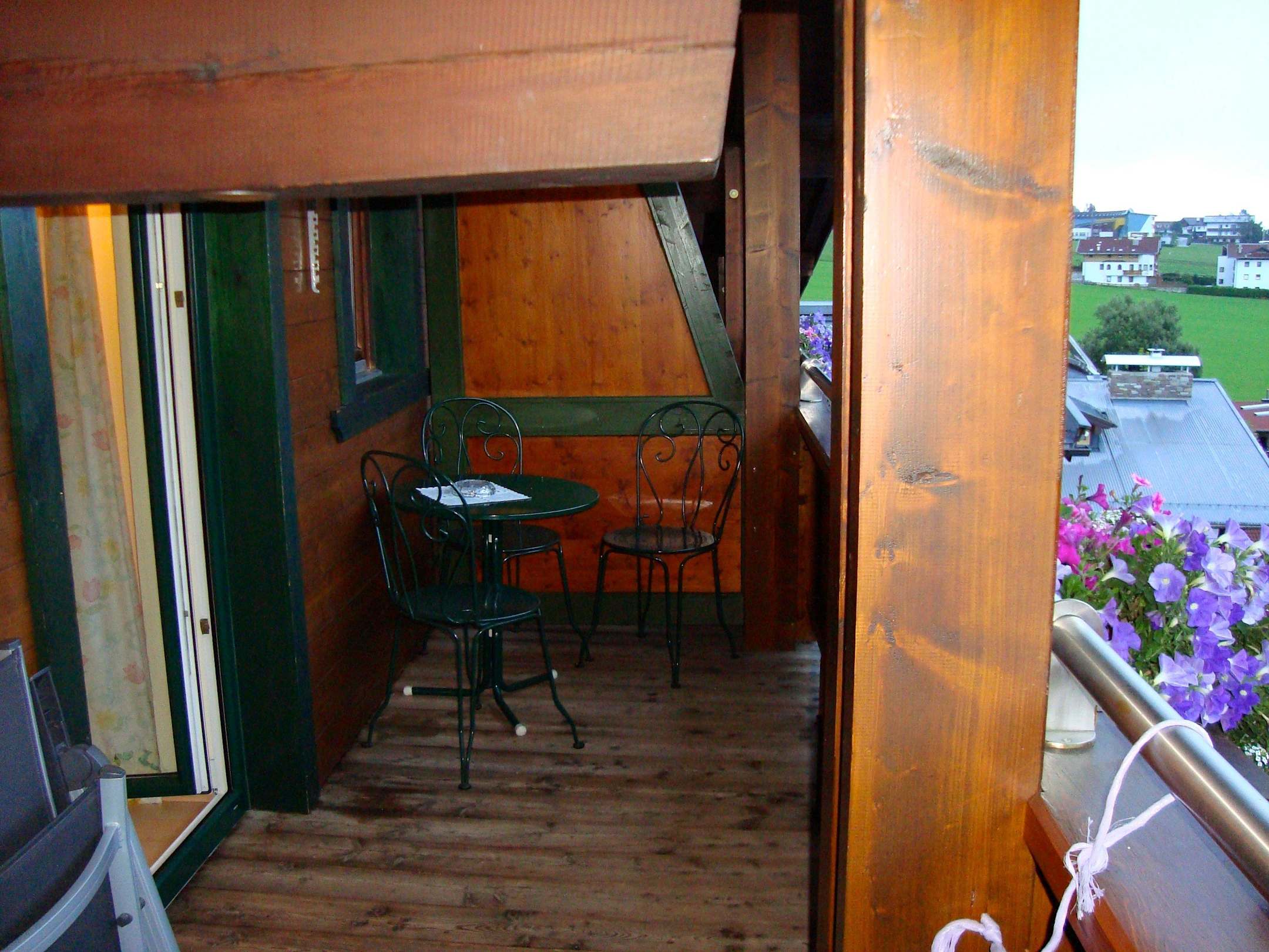 Balkonblick zum NachbarnDer Balkon mit Achenseeblick lang und schmal mit Bistrotisch und -stühlen.