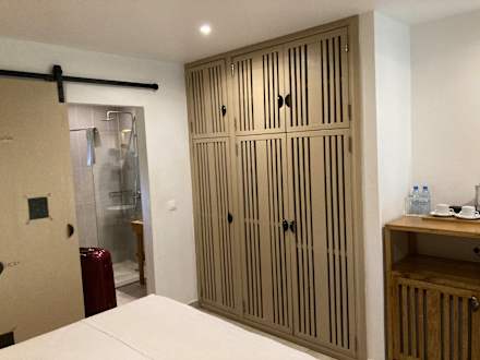 Kleiderschrank mit Safe (innen) und Blick zum Bad.