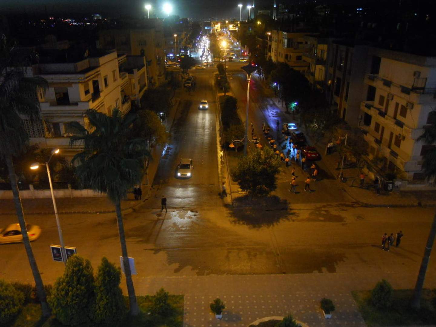 Homs bei NachtBlick aus dem Zimmer im 5. Stock auf die Strasse. Am oberen Bildrand sind die Flutlichter des Fußballstadions zu erkennen.