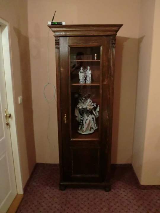 Hotelflur 2.Etage"Klassik trifft Moderne": WLAN-Router auf einem alten restauriertem Schrank im Flur des Hotels