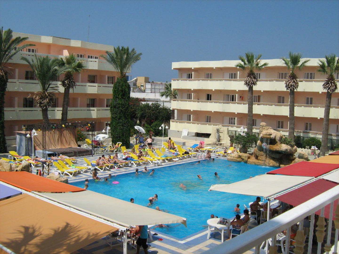 Widok z tarasu restauracji głównej na jeden z basenów i przyległe budynki hotelu.