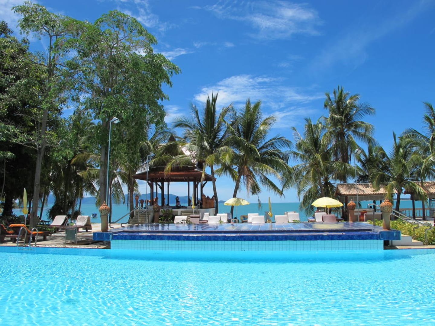 Der 3. Pool am Strand, dahinter Massage Pavillon