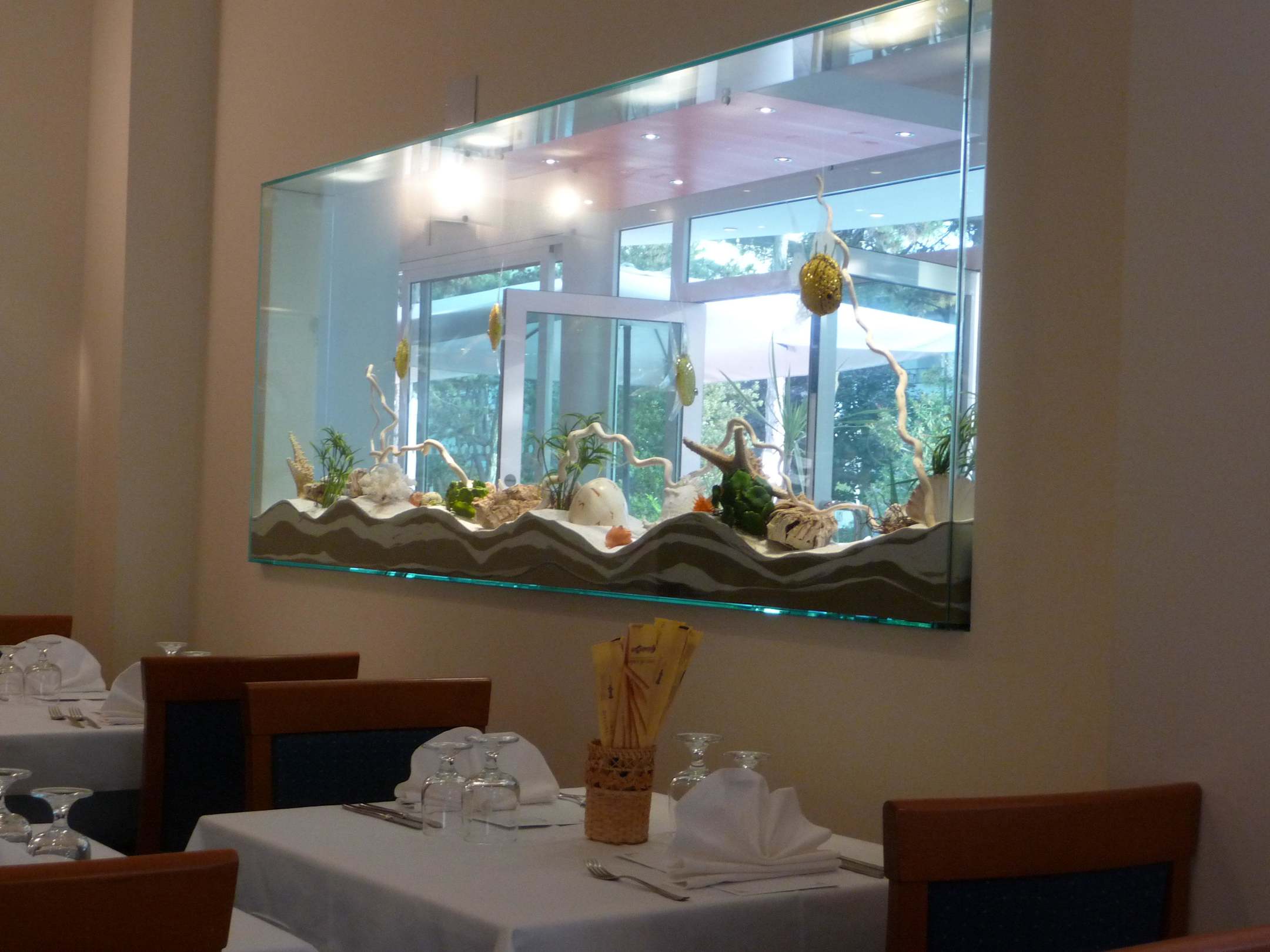Blick vom Speisesaal durch künstl. Aquarium