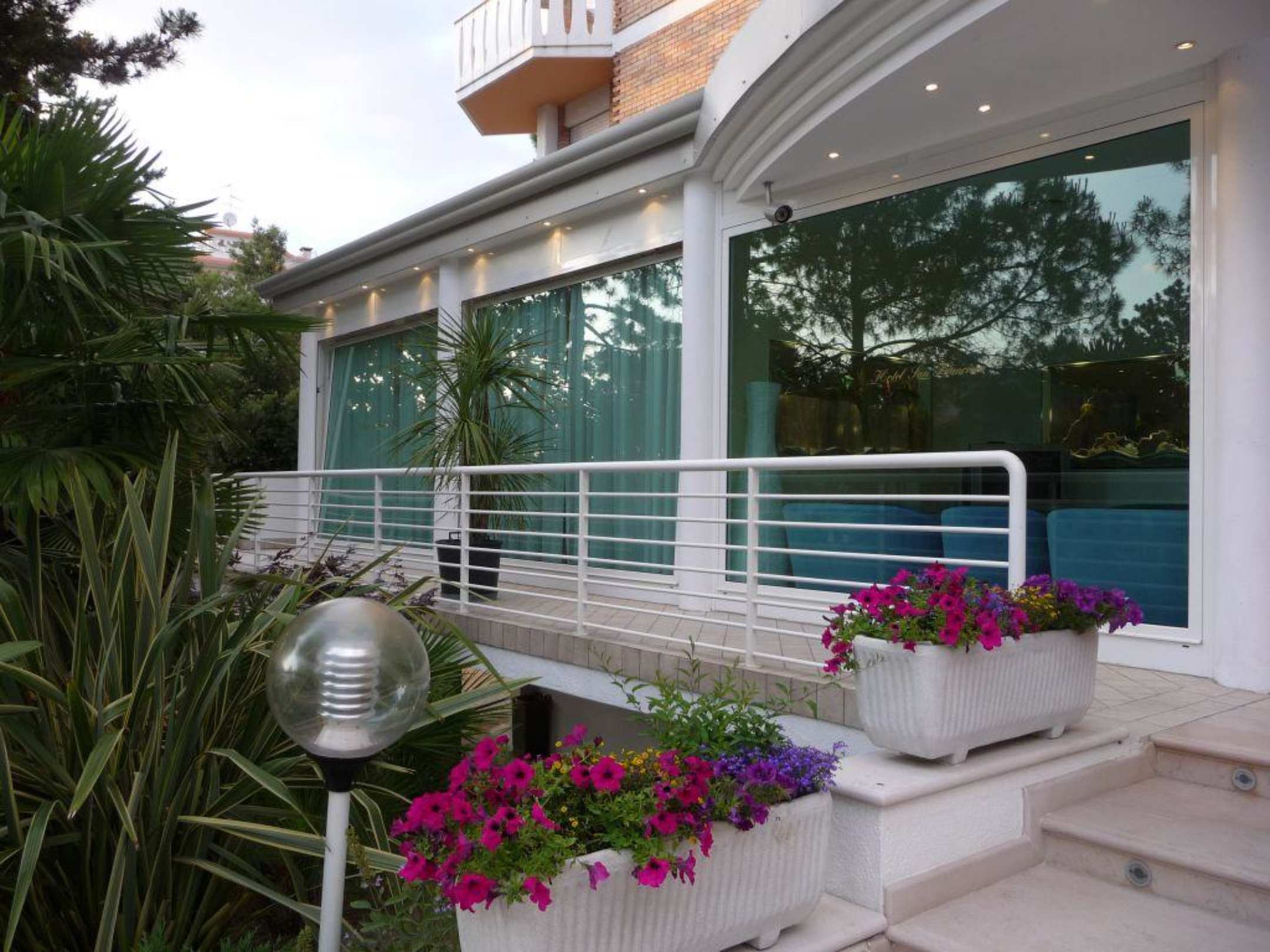 Blick auf die Fenster des Speisesaals (links) und der Lobby