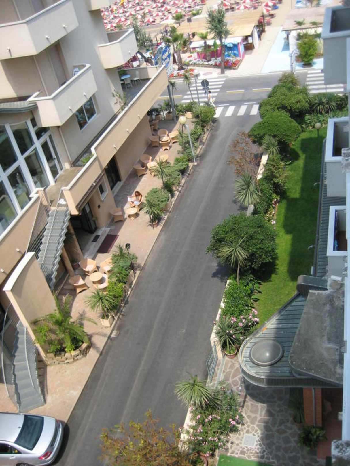 Das Foto ist vom Balkon der Seitenstraße gemacht worden. Das Zimmer ist vom Hotel San Giorgio auf der anderen Seite erkennt man das Nebengebäude Savoia. Sowie im oberen Bereich die Straße und den Strand.