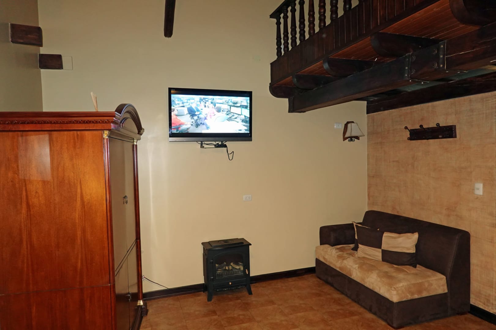 Sitzecke mit elektrischem Kamin und moderner TV-Ausstattung
