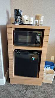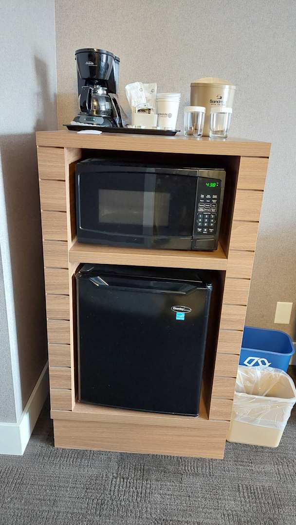 Kaffeemaschine, Mikrowelle und Kühlschrank.