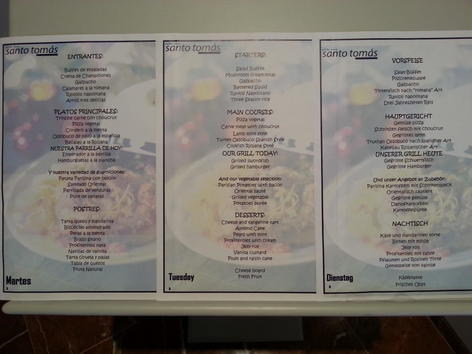 Speisekarte Hotel Santo Tomas